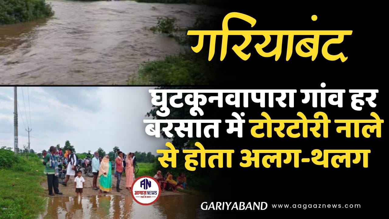 पितेश्वर हरपाल गरियाबंद। जिला मुख्यालय से महज 12 किलोमीटर दूर स्थित ग्राम घुटकूनवापारा के ग्रामीण हर साल बरसात के मौसम में भारी मुसीबतों का सामना करते हैं। गांव के पास बहने वाले टोरटोरी नाले में बाढ़ आते ही गांव का बाहरी दुनिया से संपर्क पूरी तरह टूट जाता है।