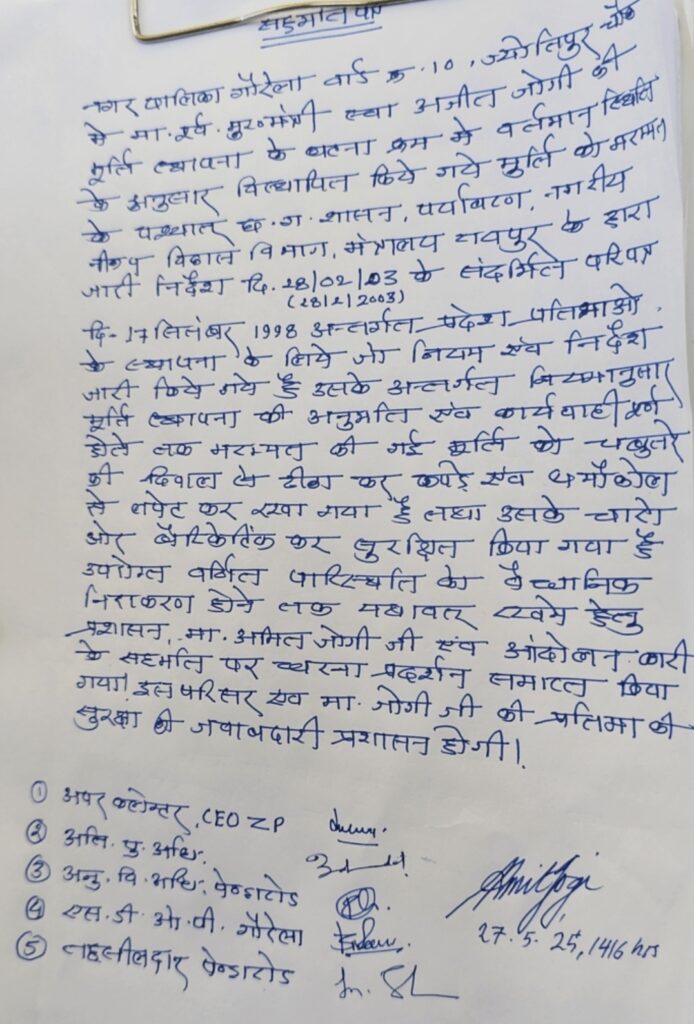 वहीं प्रतिमा स्थल पर अब आगामी निर्णय तक पुलिस सुरक्षा व्यवस्था तैनात कर दी गई है जबकि अमित जोगी ने स्वर्गीय अजीत जोगी की परसों 29 मई को पुण्यतिथि तक सहानुभूति पूर्वक निर्णय लिए जाने की बात कहते हुए प्रशासन के साथ हुए समझौते को सशर्त स्वीकारने की बात कही है।