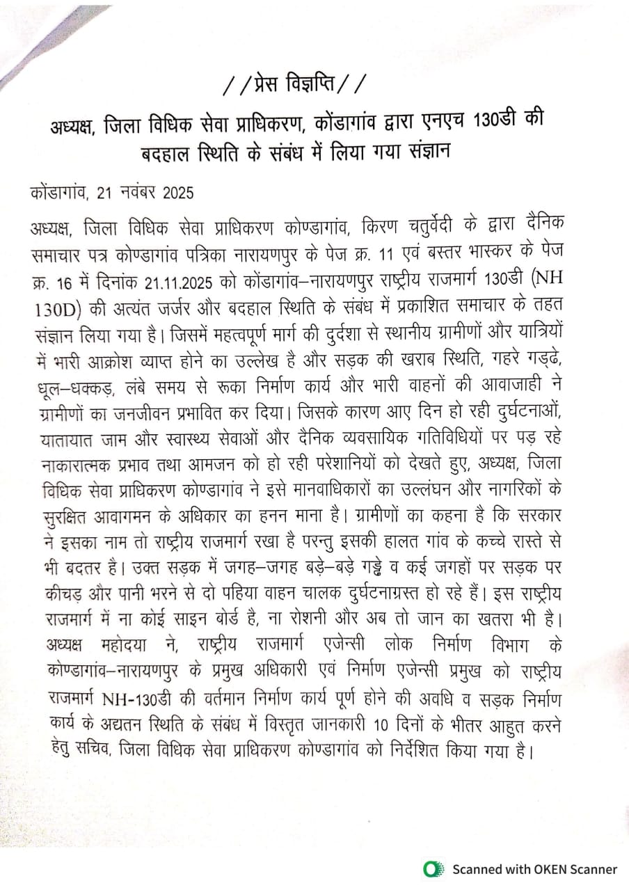 अध्यक्ष, जिला विधिक सेवा प्राधिकरण, कोंडागांव द्वारा एनएच 130डी की बदहाल स्थिति के संबंध में लिया गया संज्ञान