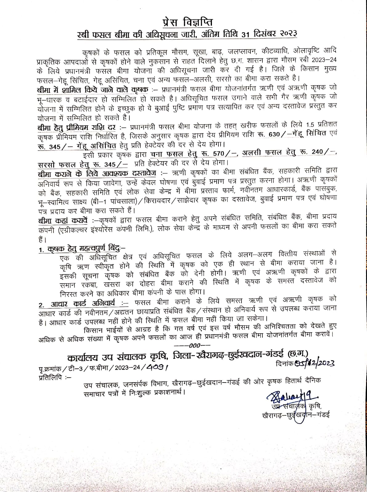 फसल बीमा हेतु अधिसूचना जारी, अंतिम तिथि 31 दिसंबर