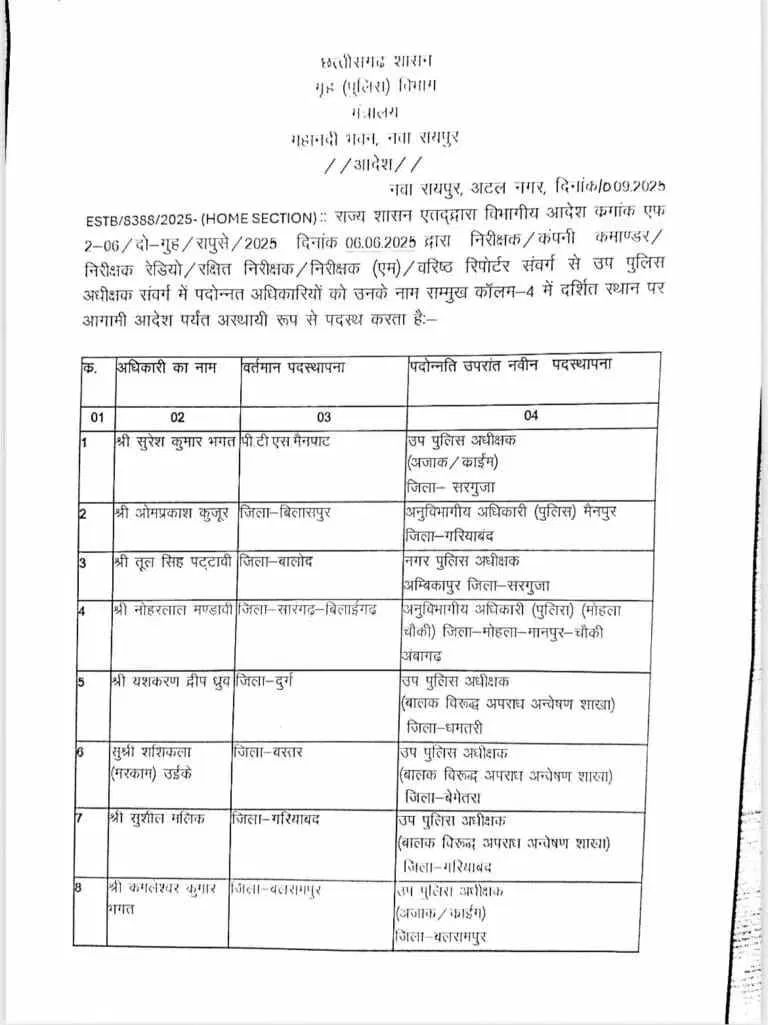 इस फेरबदल में हाल ही में निरीक्षक से डीएसपी पद पर पदोन्नत हुए अधिकारियों को भी जिम्मेदारी सौंपी गई है। रमाकांत साहू को रायपुर सिविल लाइन का नया सीएसपी नियुक्त किया गया है।