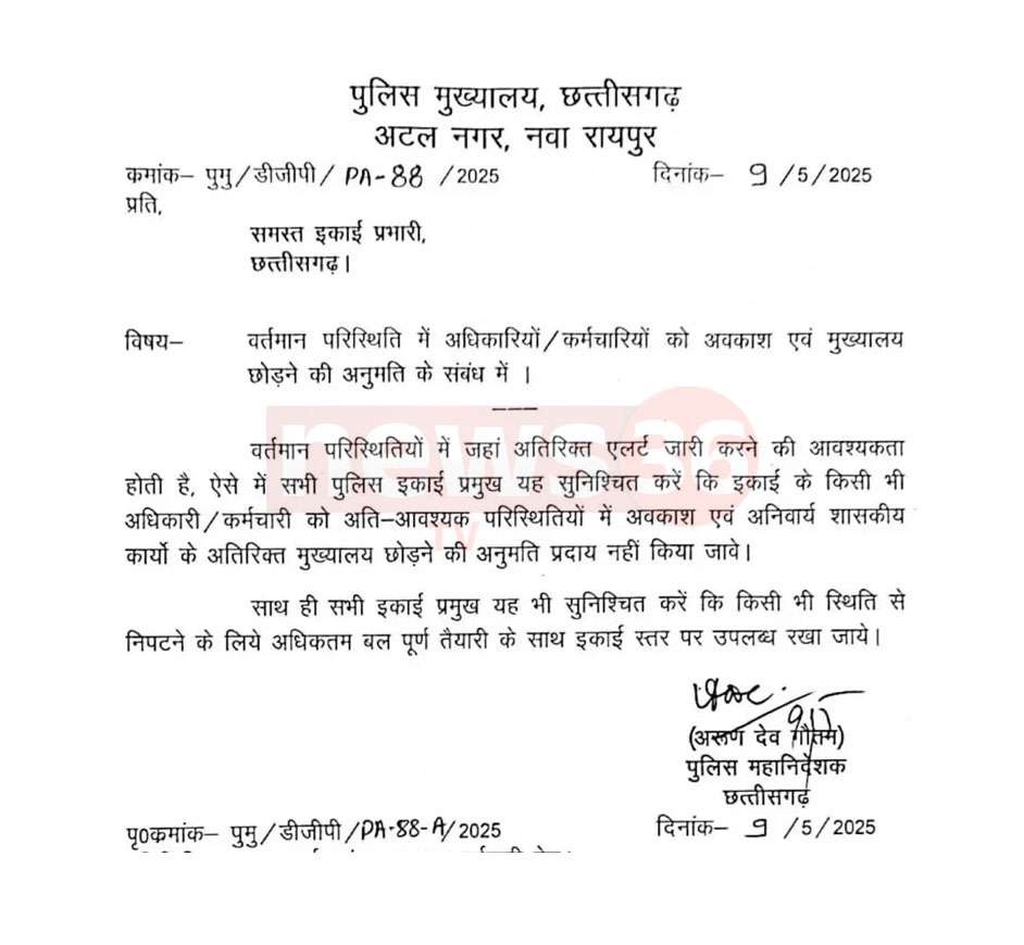 रायपुर। भारत-पाकिस्तान के बीच लगातार बढ़ते तनाव को देखते हुए छत्तीसगढ़ में भी हाई अलर्ट घोषित कर दिया है। सरकार ने पुलिस विभाग में छूट्टी देने पर रोक लगा दी है। इसके अलावा कि, कोई अति आवश्यक परिस्थिति हो।