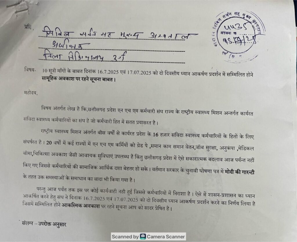 हड़ताल से एक दिन पहले, 15 जुलाई को दुर्ग जिला अस्पताल में एनएचएम कर्मचारी संघ के पदाधिकारियों ने सिविल सर्जन डॉ. आशीषन कुमार मिंज को ज्ञापन सौंपा। इस दौरान जिला एनएचएम अध्यक्ष डॉ. आलोक शर्मा सहित डॉ. ओ. पी. वर्मा, योगेश चंद्राकर, ललित कुमार साहू, कविता ताम्रकार, हिमांशु चंद्राकर, पूजा शर्मा, नेहा वर्मा, हिमरानी साहू, त्रिलोक चंद, वेगु गजपाल और रविना जैसे पदाधिकारी मौजूद रहे।
