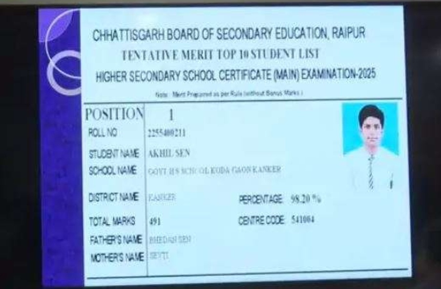दसवीं में छात्राएं 80.73 और छात्र 71.39 उत्तीर्ण,हायर सेकेंडरी परीक्षा में पास परीक्षार्थियों की कुल संख्या 194906,परीक्षा फल 81.87% रहा,बालिकाओं का प्रतिशत 84.67 ,हायर सेकेंडरी परीक्षा में बालकों का प्रतिशत 78.07 रहा, छत्तीसगढ़ हायर सेंकेंडरी में कांकेर के अखिल सेन ने किया टॉप