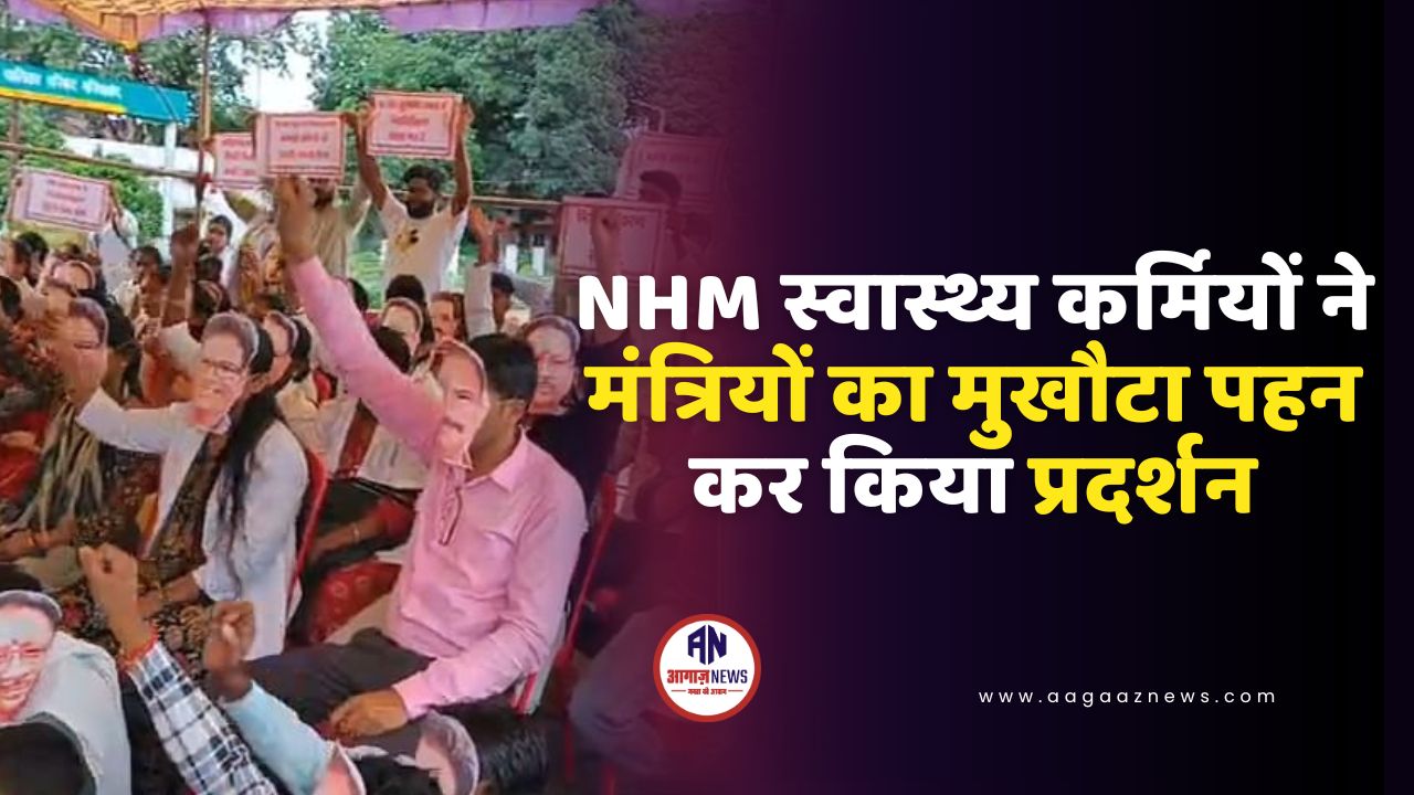 NHM स्वास्थ्य कर्मियों ने मंत्रियों का मुखौटा पहन कर किया प्रदर्शन