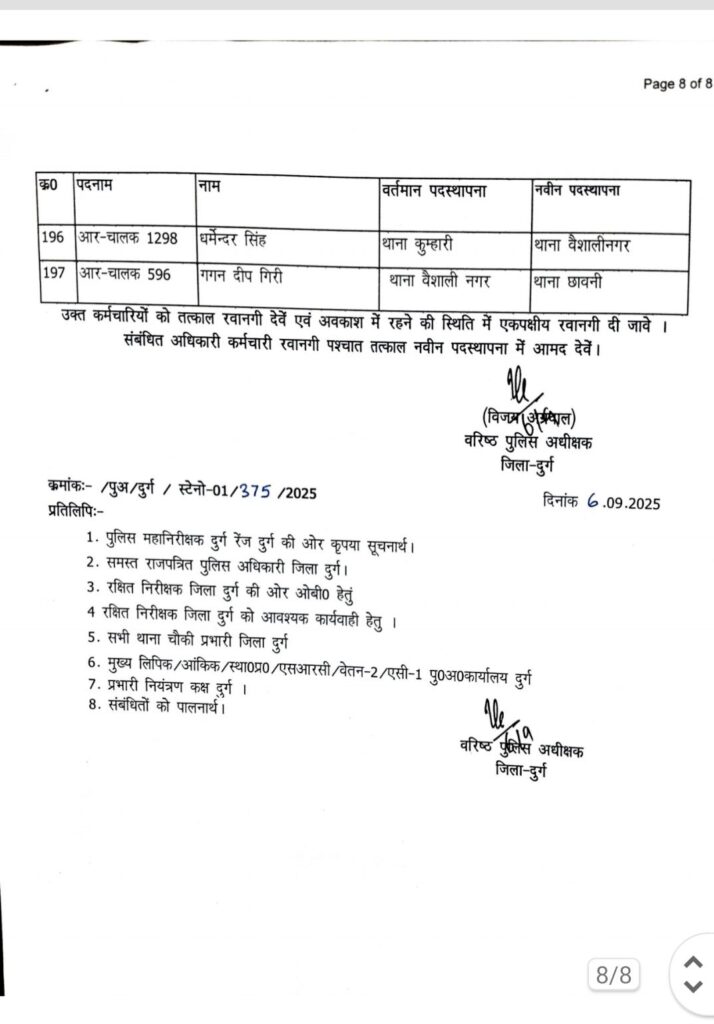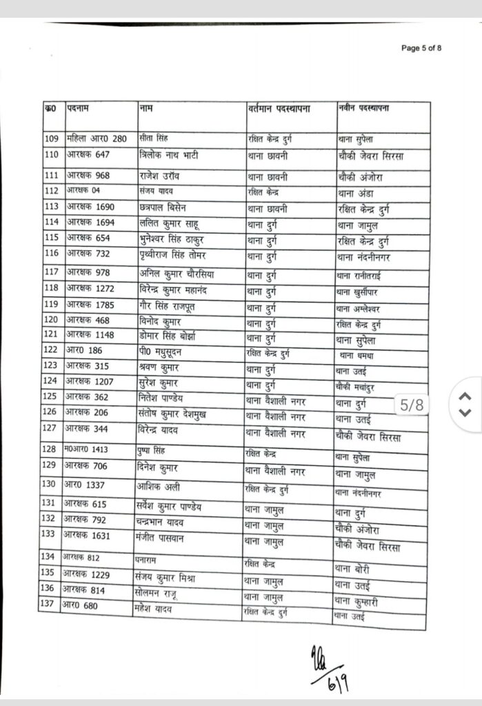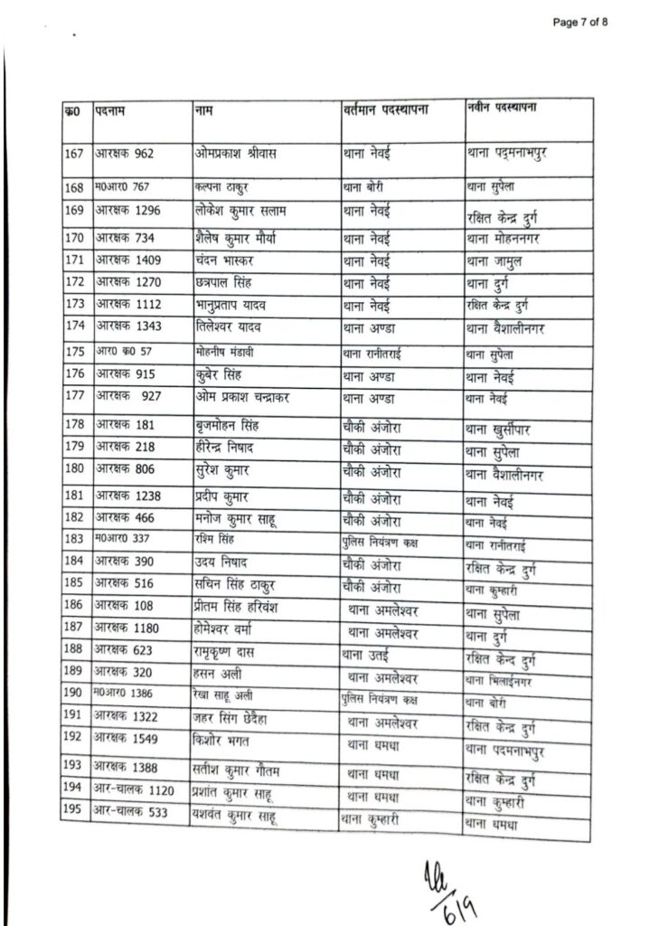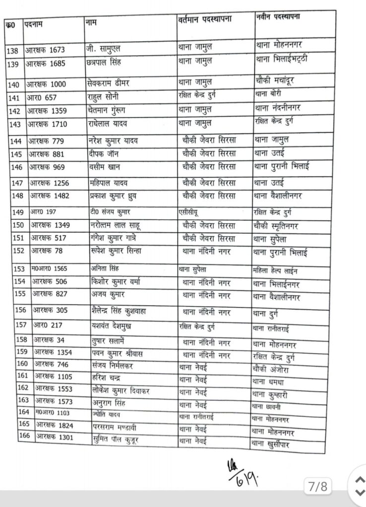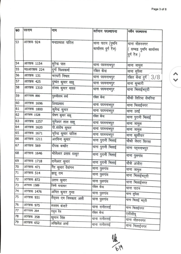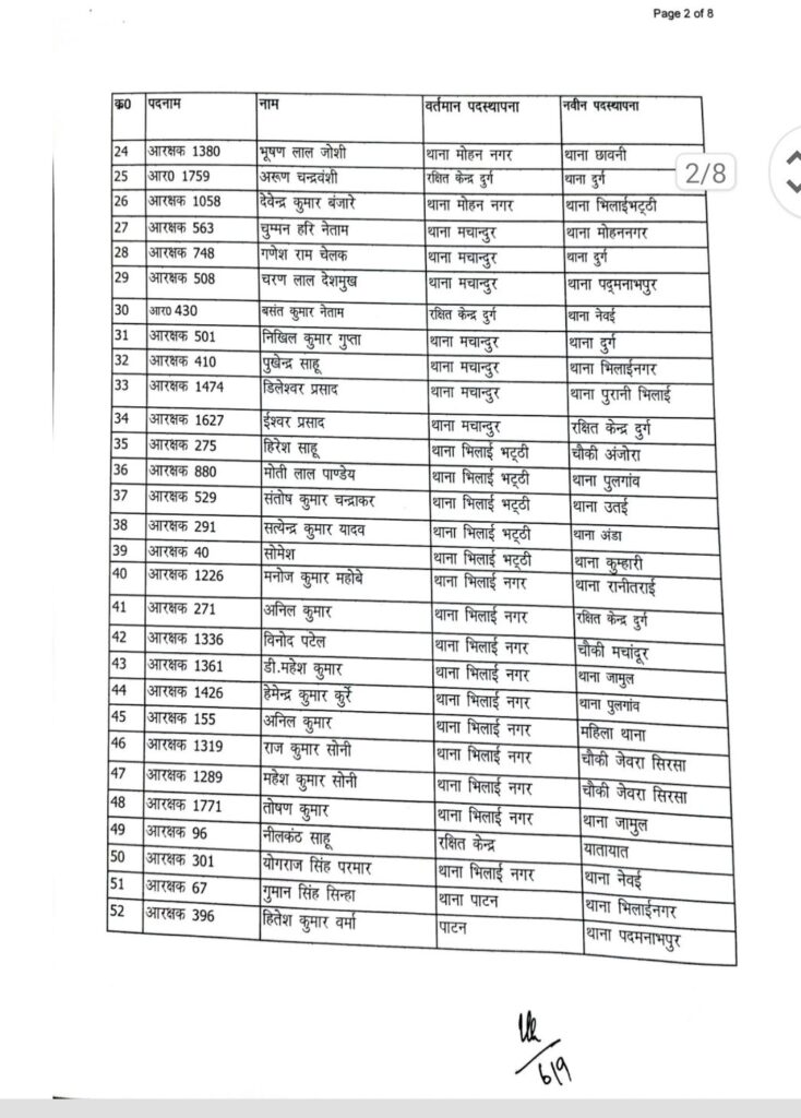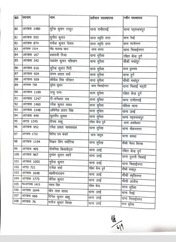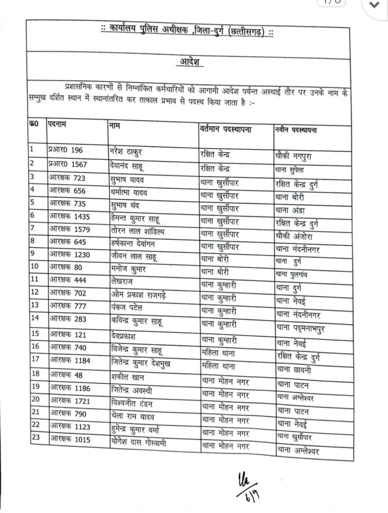पदस्थापना आदेश में थाना दुर्ग, भिलाई नगर, पदमनाभपुर, मोहन नगर, पुलगांव, स्मृति नगर, नेवई, उतई, अमलेश्वर, जामुल, अंडा, पाटन, खुर्सपार, चरोदा समेत जिले के अधिकांश थाने और चौकियां शामिल हैं।