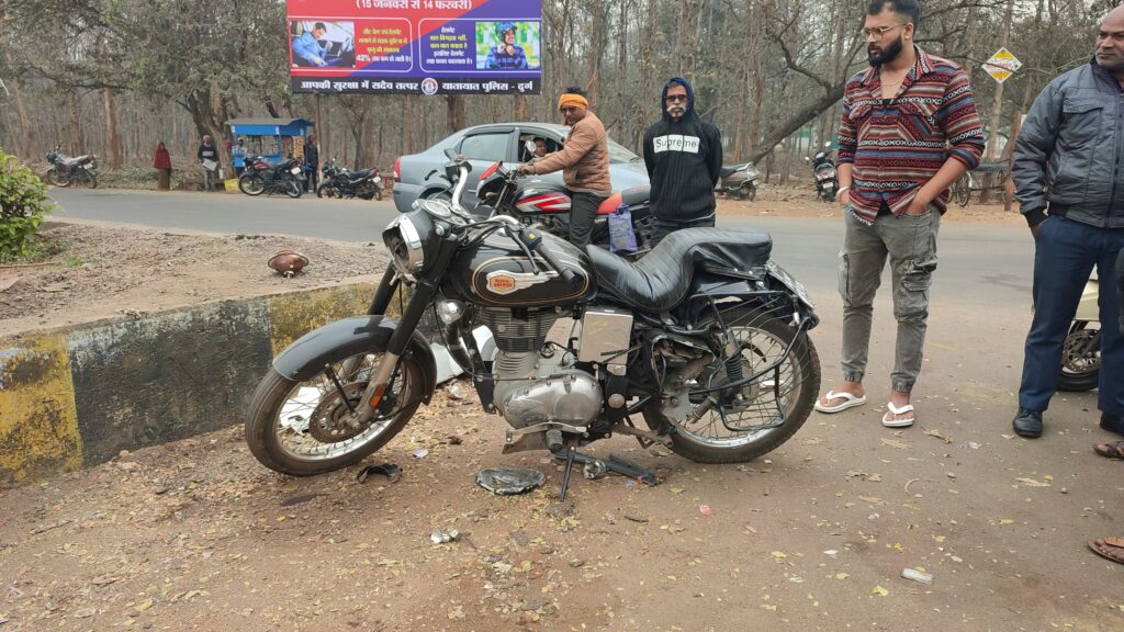 भिलाई l भिलाई के टाउनशिप एरिया में एक तेज रफ्तार कार चालक ने बुलेट सवार को पीछे से टक्कर मार दी। टक्कर इतनी तेज थी कि बुलेट चालक हवा में उछल कर दूर जा गिरा और उसका सिर पत्थर से टकरा गया।