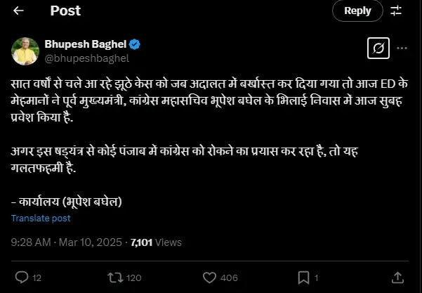 भूपेश बघेल ने ईडी की छापेमारी के करीबन डेढ़ घंटे बाद सोशल मीडिया प्लेटफार्म ग् पर किए अपने पोस्ट में सेक्स सीडी कांड में अदालत से मिली राहत का जिक्र करते हुए कहा कि सात वर्षों से चले आ रहे झूठे केस को जब अदालत में बर्खास्त कर दिया गया तो आज म्क् के मेहमानों ने पूर्व मुख्यमंत्री, कांग्रेस महासचिव भूपेश बघेल के भिलाई निवास में आज सुबह प्रवेश किया है. तो वहीं दूसरी ओर इस छापेमारी का कनेक्शन पंजाब से जोड़ते हुए कहा कि अगर कोई पंजाब में कांग्रेस को रोकने का प्रयास कर रहा है, तो यह गलतफहमी है.