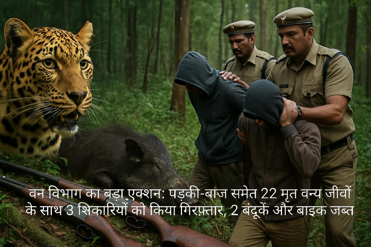 वन विभाग का बड़ा एक्शन: पड़की-बाज समेत 22 मृत वन्य जीवों के साथ 3 शिकारियों को किया गिरफ़्तार, 2 बंदूकें और बाइक जब्त