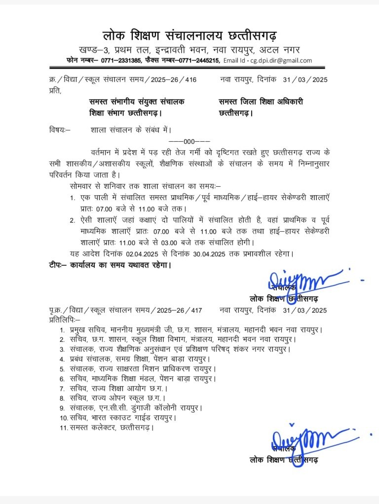 बता दें कि,छत्तीसगढ़ लोक शिक्षण संस्थान ने इस संबंध में आदेश जारी कर सभी जिला शिक्षा अधिकारियों (डीईओ) और कमिश्नर को पत्र लिखे गए हैं। वहीं जारी किए गए आदेश का उद्देश्य सभी स्कूली बच्चों को प्रचंड गर्मी से बचाना और उनकी सुरक्षा सुनिश्चित करना है।