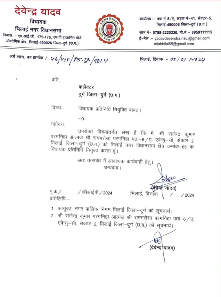 भिलाईlभिलाई नगर विधायक श्री देवेन्द्र यादव ने सेक्टर 2 निवासी श्री राजेंद्र परगनिहा को विधायक प्रतिनिधि मनोनीत किया है। विधायक श्री यादव ने कलेक्टर. भिलाई निगम आयुक्त को पत्र जारी करते हुए बताया कि श्री परगनिहा जिला प्रशासन. के बैठक में विधायक की अनुपस्थिति में शामिल होंगे।बता दें कि श्री परगनिहा बीएसपी के सेवानिवृत्त कर्मचारी हैं। वे बीएसपी कर्मचारियों और श्रमिकों के हित को लगातार प्रबंधन के समक्ष उठाते रहते हैं और निराकरण की दिशा उनके प्रयास सफल भी हुए हैं