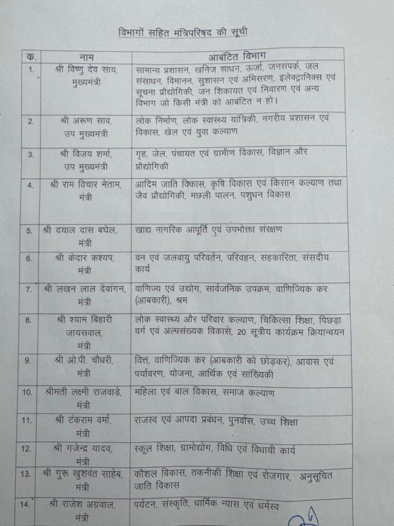 रायपुर, 19 अगस्त 2025। मुख्यमंत्री विष्णुदेव साय की कैबिनेट में आज शपथ लेने वाले तीनों नए मंत्रियों को विभागों का बंटवारा कर दिया गया है। मंत्रियों को मिले विभाग इस प्रकार हैं