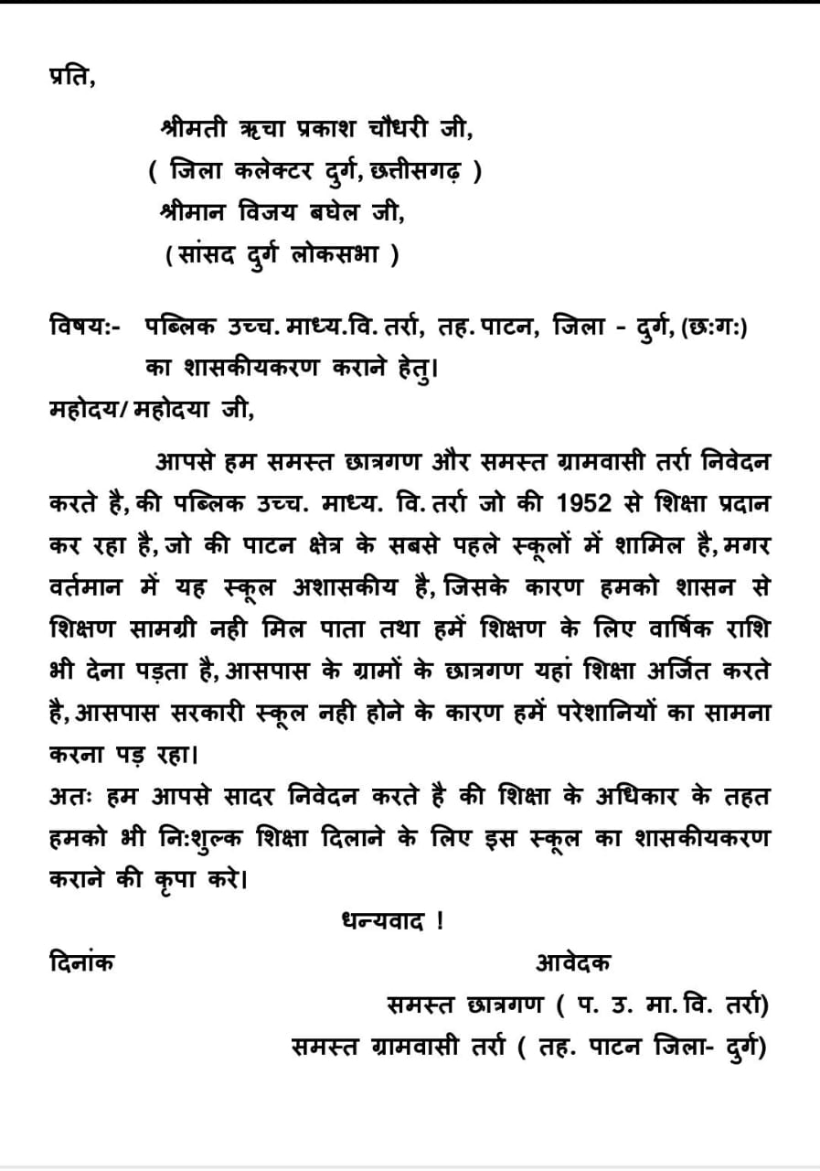 जिला स्तरीय समस्या निवारण शिविर घुघुवा में पब्लिक उच्चतर माध्यमिक विद्यालय तर्रा के शासकीयकरण के लिए दिया गया आवेदन