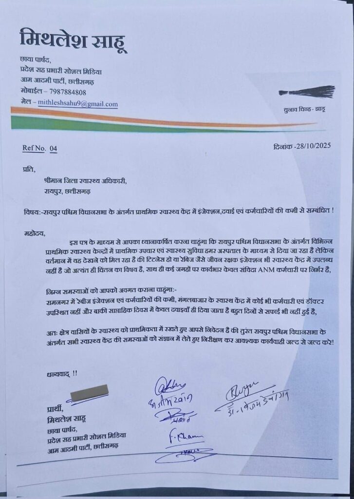 इन गंभीर अनियमितताओं को लेकर मिथलेश साहू और उनकी टीम ने मुख्य चिकित्सा एवं स्वास्थ्य अधिकारी (CMHO), रायपुर को ज्ञापन सौंपा। ज्ञापन में तत्काल स्टाफ की नियुक्ति, दवाओं की आपूर्ति सुनिश्चित करने और अवैध उपयोग की जांच कर दोषियों पर कार्रवाई की मांग की गई।