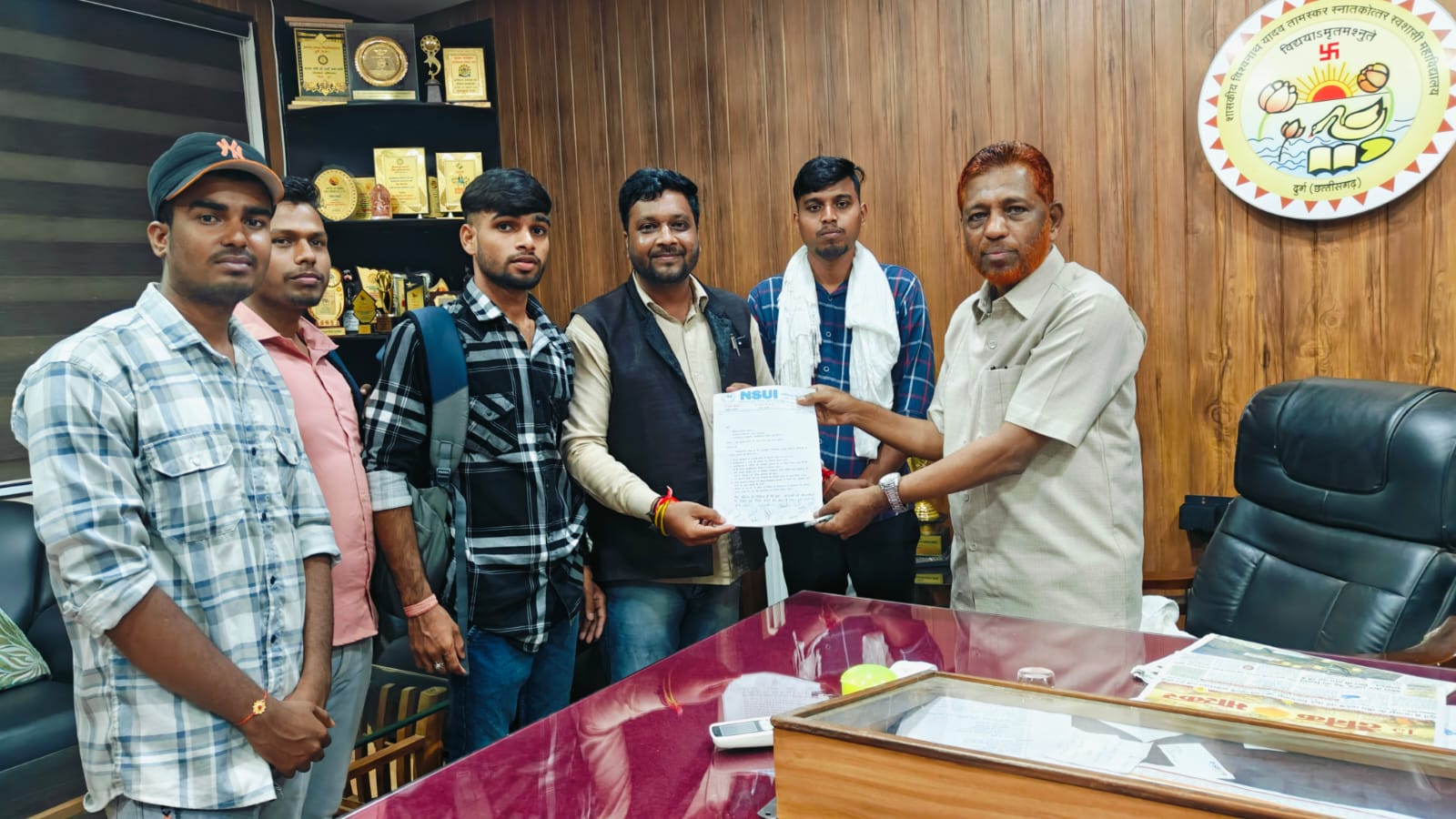 शासकीय विश्वनाथ यादव तामस्कर स्नातकोत्तर स्वशासी महाविद्यालय दुर्ग, जिला दुर्ग (छ.ग.) में एनएसयूआई के प्रदेश महासचिव आदित्य नारंग के नेतृत्व में सात सुत्रीय मांगों को लेकर प्राचार्य महोदय जी को ज्ञापन सौंपा गया !