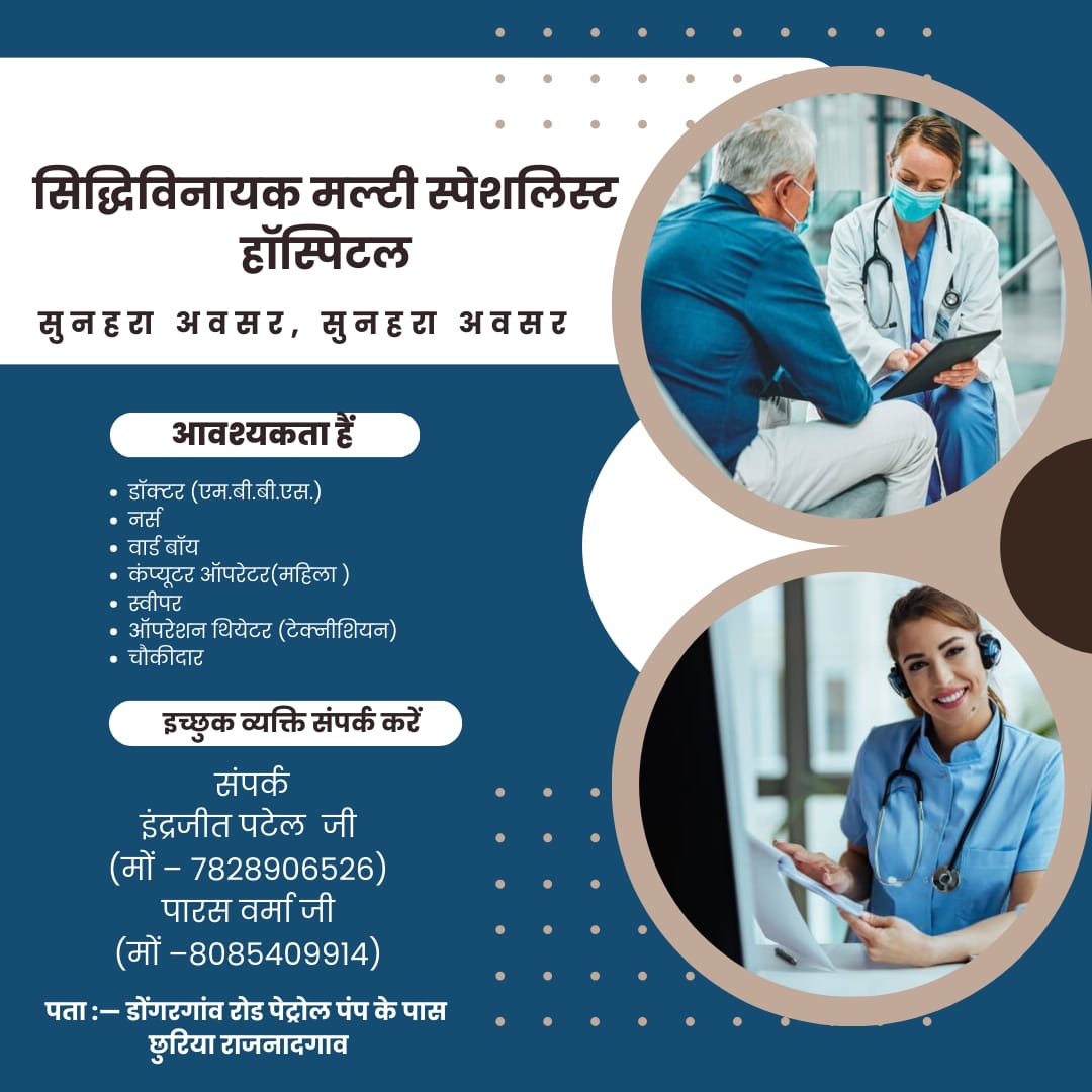 आवश्यकता आवश्यकतासुनहरा अवसर, सुनहरा अवसरसिद्धिविनायक मल्टी स्पेशलिस्ट हॉस्पिटल में डॉक्टर एम.बी.बी.एस,नर्स,वार्ड बॉय, कंप्यूटर ऑपरेटर,स्वीपर, चौकीदार की आवश्यकता हैइच्छुक व्यक्ति नीचे दिए गए नंबर में संपर्क कर सकते हैं