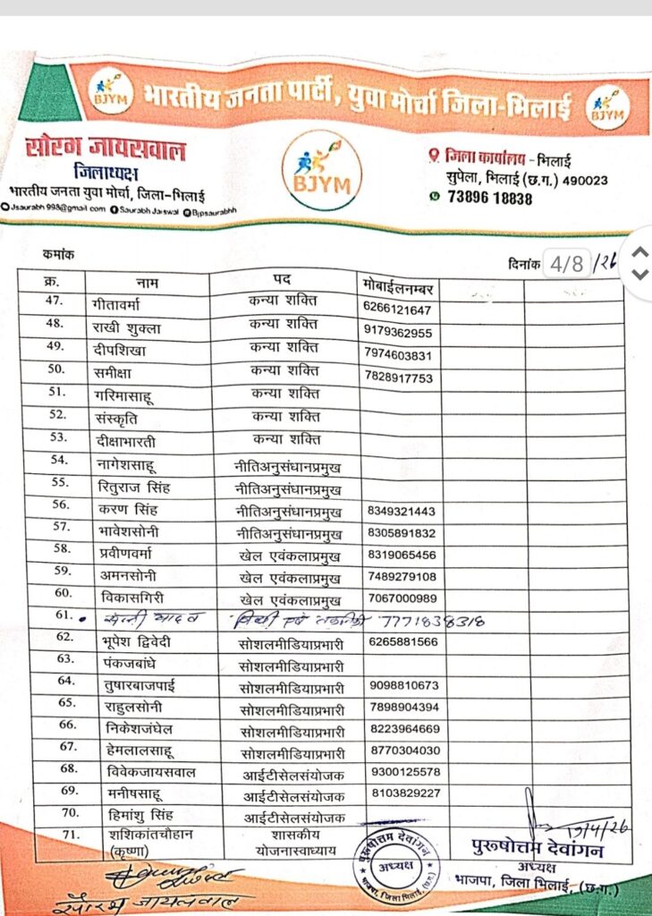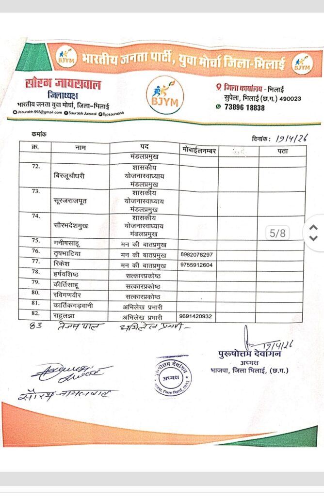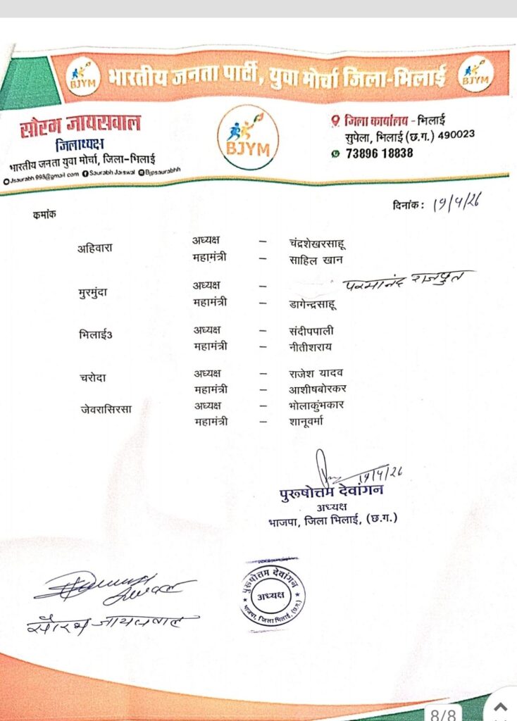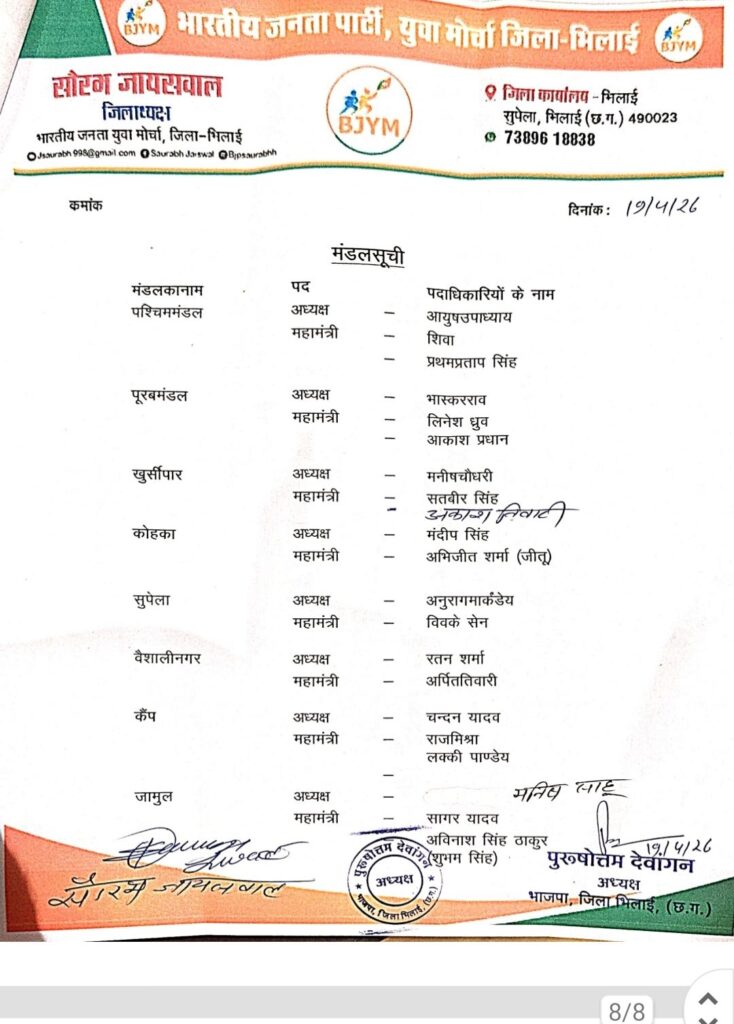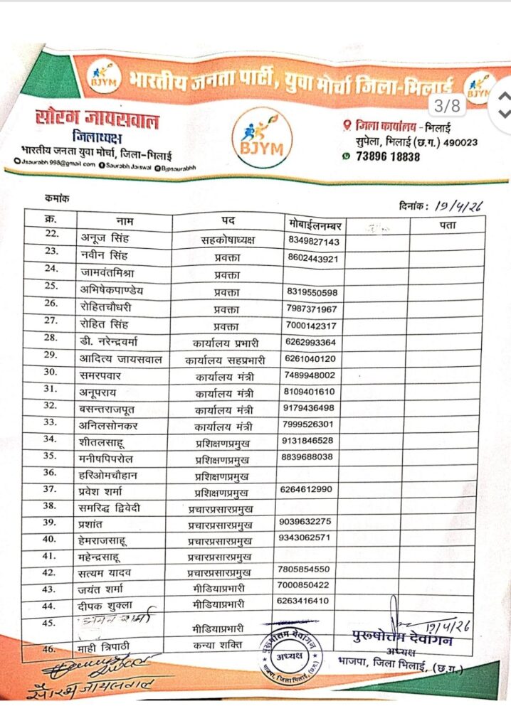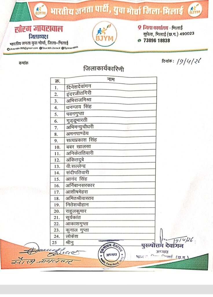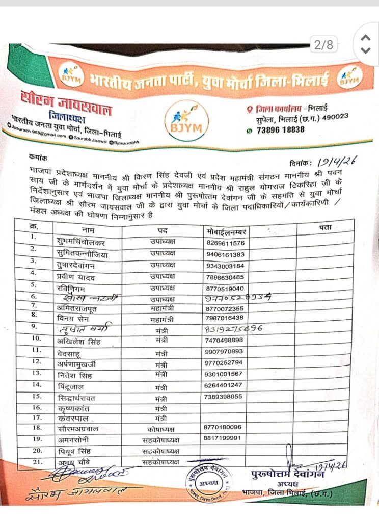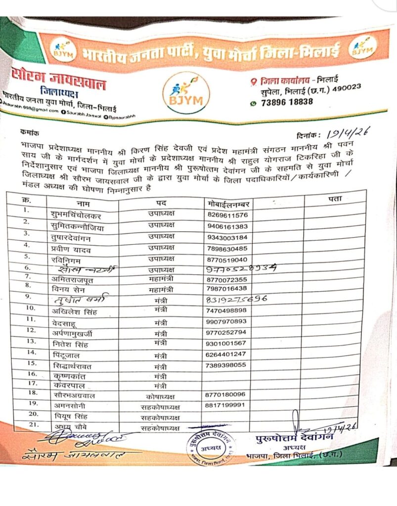 भाजयुमो भिलाई जिला कार्यकारिणी की घोषणा, पदाधिकारियों की सूची जारी