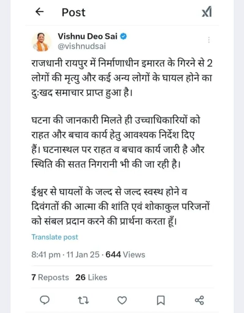 मिली जानकारी के अनुसार रायपुर के वीआईपी रोड में अविनाश एलिगेंस की निर्माणाधीन रेसिडेंशियल कॉप्लेक्स के सातवीं मंजिल पर छत ढालने के लिए सेंट्रिंग का काम चल रहा था इसी दौरान शनिवार को पूरी की पूरी सेंटिंरग गिर गई और नीचे और उपर काम कर रहे मजदूर उसकी चपेट में आ गये। इस हादसे में कई मजदूर सेंटिंरग प्लेट तथा लोहे की रॉड के नीचे दब गये। बताया जाता है कि इस हादसे में 11 मजदूर दब गये थे जिनमें से 9 लोगों को बाहर निकाल लिय गया और अस्पताल पहुंचाया गया जहां इलाज के दौरान दो मजदूरों की मौत हो गई। वहीं दो की हालत गंभीर बताई जा रही है। वहीं दो मजदूरों को देर शाम तक नही निकाला जा सका था। घायलों में बिहार के मजदूर भी शामिल हैं। घटना की सूचना मिलते ही पुलिस और प्रशासन की टीम बचाव कार्य में जुट गई है। मौके पर बड़ी संख्या में पुलिस बल मौजूद है। रेस्क्यू ऑपरेशन जारी है। मौत की पुष्टि रायपुर कलेक्टर गौरव कुमार सिंह ने पुष्टि की है।