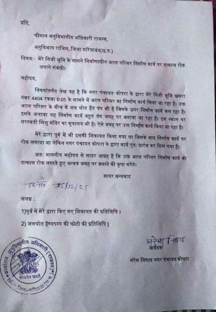 नगर निवासी नरेश निषाद ने इस निर्माण को लेकर एसडीएम राजिम को आवेदन सौंपकर गंभीर आपत्ति दर्ज कराई है। उन्होंने बताया कि उनकी निजी भूमि खसरा नंबर 4404, रकबा 0.05 हेक्टेयर के ठीक सामने और उससे सटी हुई जगह पर अटल परिसर का निर्माण कराया जा रहा है।