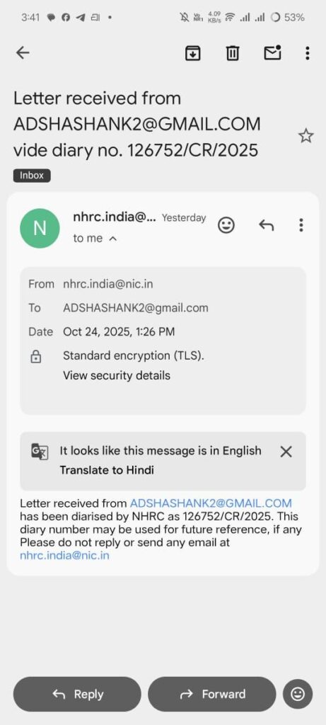 1. एनएचआरसी द्वारा जारी ईमेल की प्रति (डायरी संख्या 126752/CR/2025)