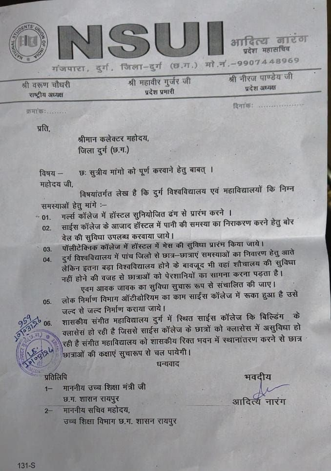 दुर्ग। छात्र हित से जुड़े विभिन्न मुद्दों को लेकर एनएसयूआई के पदाधिकारियों ने दुर्ग कलेक्टर को ज्ञापन सौंपा। यह ज्ञापन एनएसयूआई के प्रदेश महासचिव आदित्य नारंग के निर्देश पर सौंपा गया, जिसमें जिले के विश्वविद्यालय और महाविद्यालयों में छात्रों को हो रही समस्याओं से अवगत कराया गया।