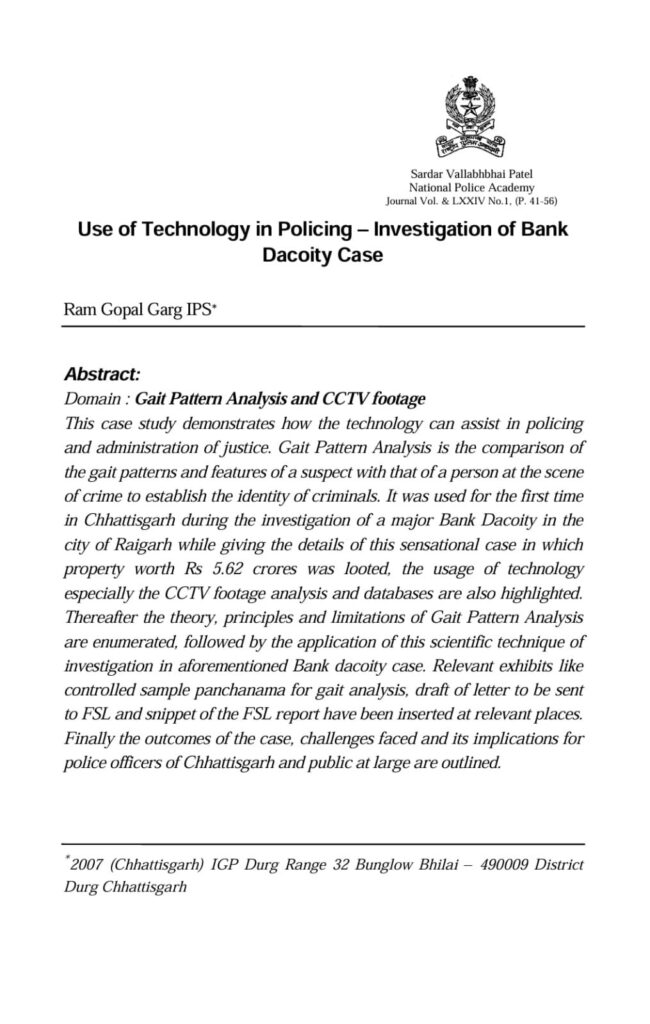 यह शोध लेख तकनीक आधारित अपराध अन्वेषण की दिशा में एक उल्लेखनीय योगदान है। इसमें श्री गर्ग ने रायगढ़ में हुई एक बड़ी बैंक डकैती की जांच के दौरान Gait Pattern Analysis और CCTV Footage Analysis जैसी अत्याधुनिक तकनीकों के उपयोग का उल्लेख किया है। यह पहली बार था जब छत्तीसगढ़ पुलिस ने Gait Analysis तकनीक का उपयोग अपराधियों की पहचान के लिए वैज्ञानिक प्रमाण के रूप में किया।